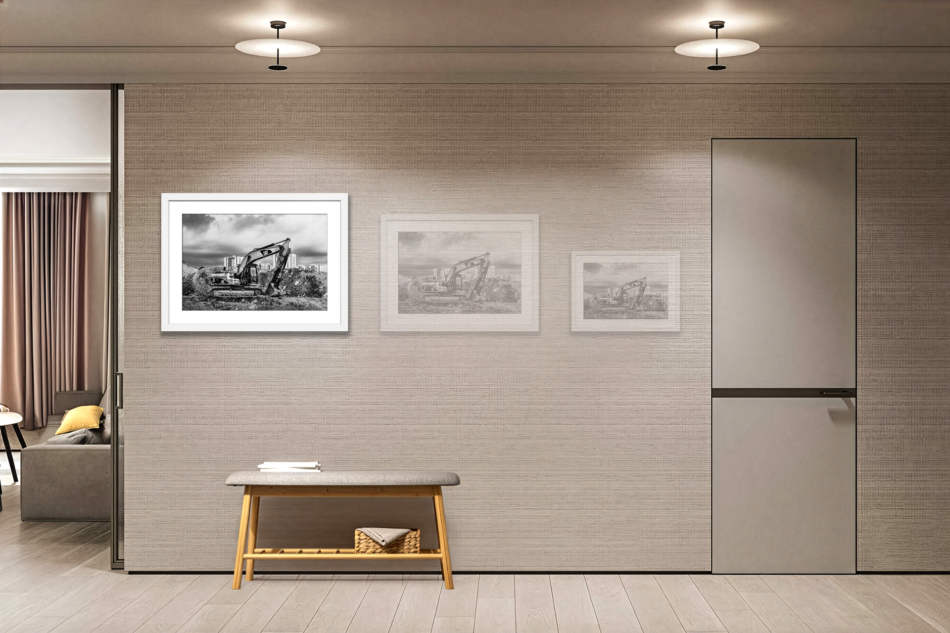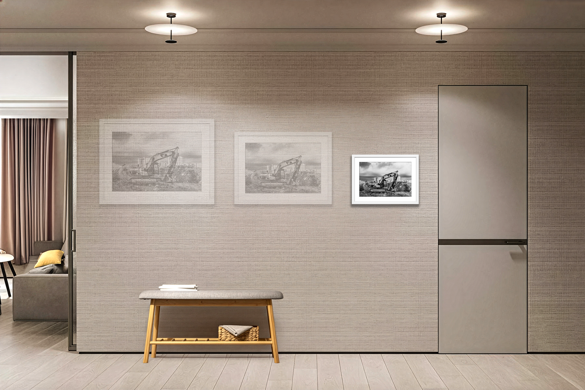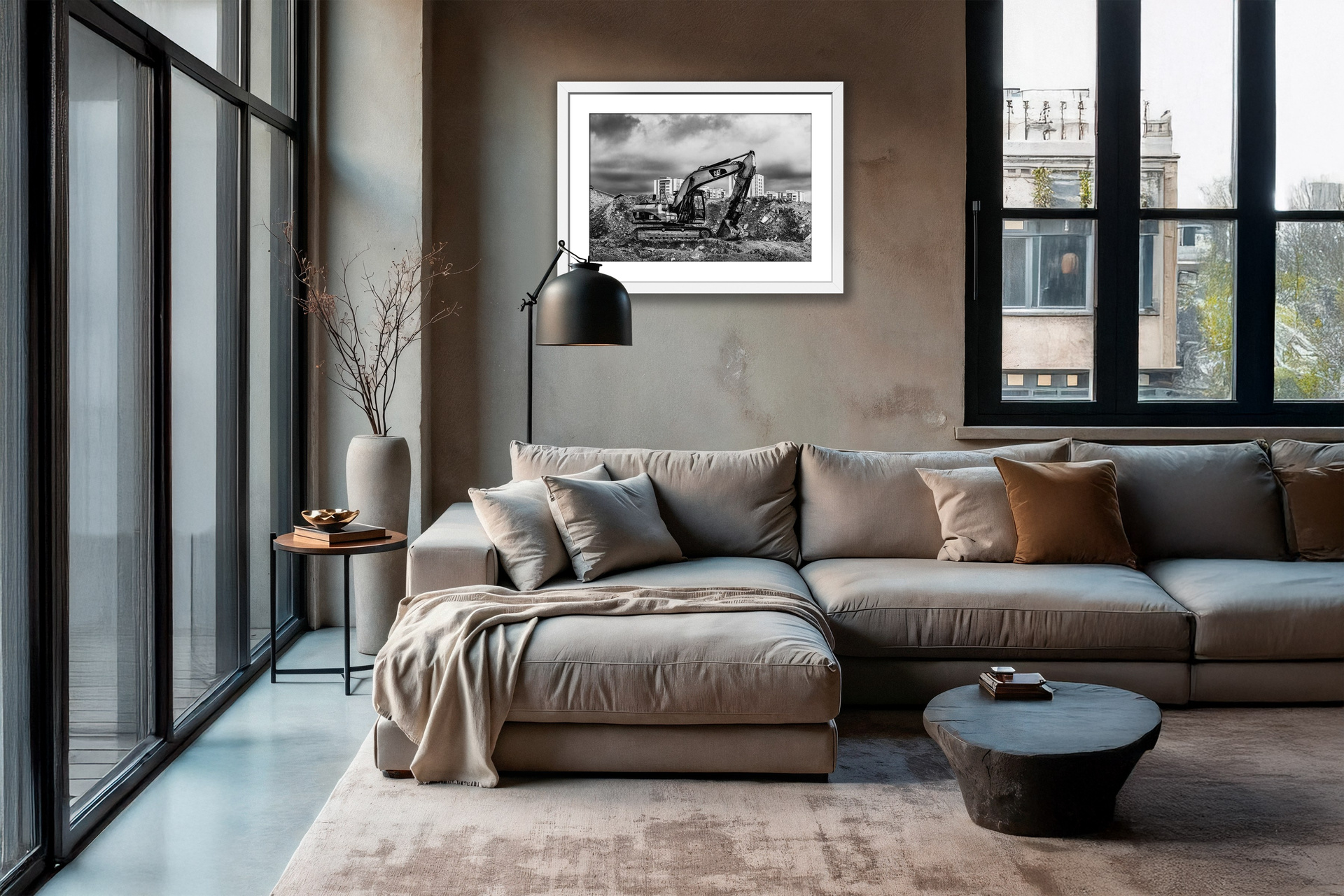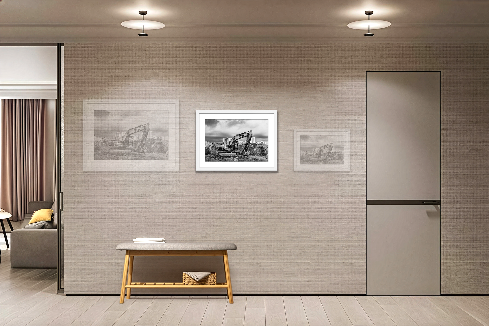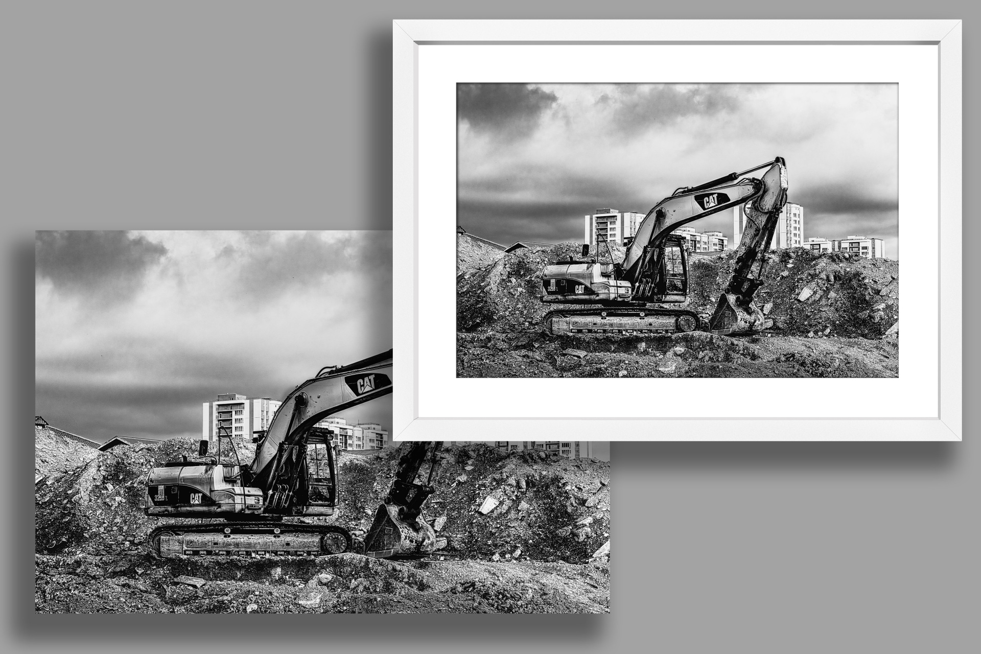 Отказ от цвета позволяет сосредоточиться на материальности сцены: фактуре земли, весе металла и плотности воздуха. Свет и тень здесь формируют ощущение тяжести, ожидания и немого диалога между техникой и средой.